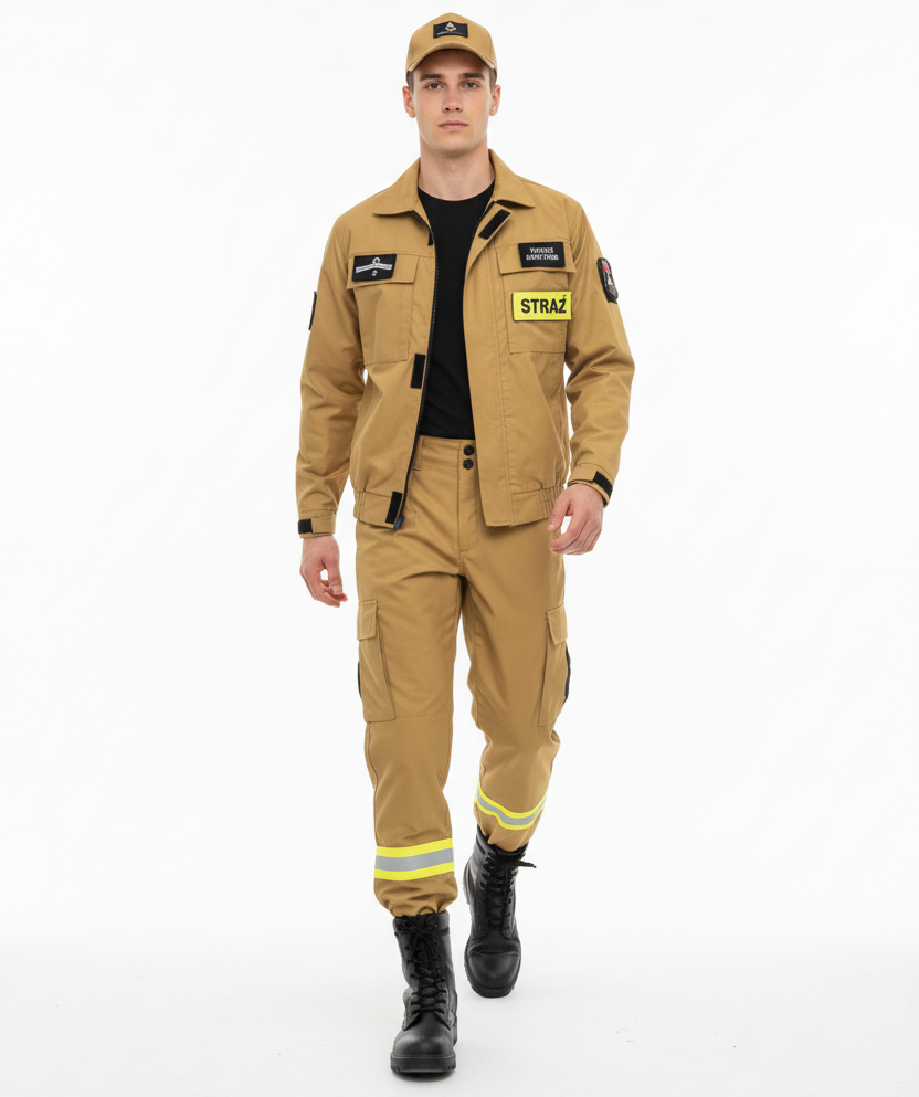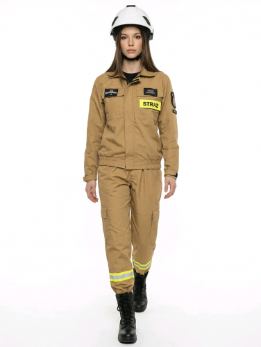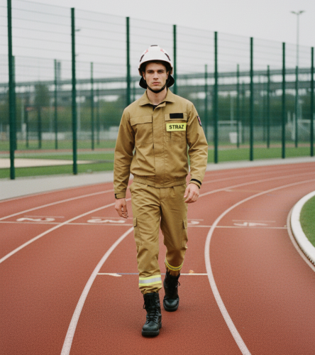 Ubranie idealnie nadaje się do udziału w zawodach sportowo-pożarniczych ze względu na zwężane spodnie i gumkę w nogawce.